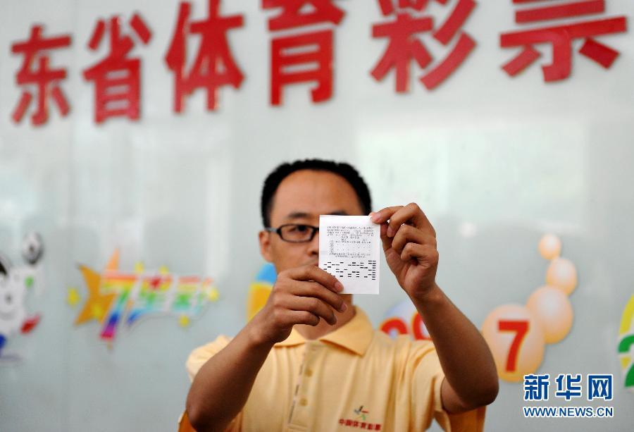 8月11日,在山东省体育彩票管理中心,工作人员展示得4.97亿大奖的彩票。新华社记者 徐速绘 摄 图片来源:新华网
