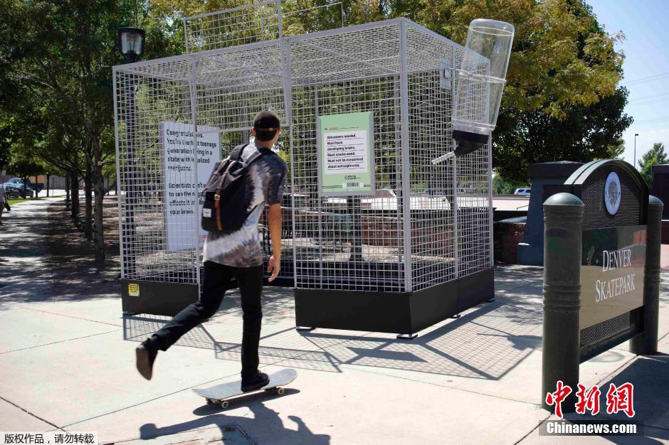 当地时间8月12日,美国丹佛图书馆外、公园等地设置巨型实验室老鼠笼,提醒年龄在12岁到15岁的年轻人远离大麻,避免遭其毒害,成为实验室的小白鼠。这项活动由科罗拉多州州长办公室暂住,斥资200万美元,警醒世人大麻的危害。