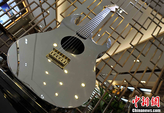 8月13日,在福建武平县不锈钢产品展示中心,一把不仅可以弹奏还可以用来装饰家居的不锈钢吉他吸引了许多人前来观赏和客商的关注。张斌 摄
