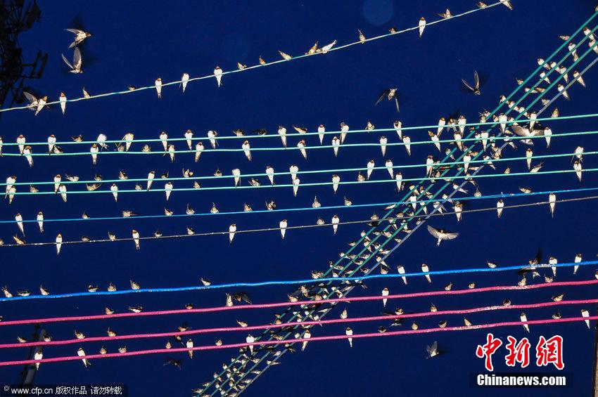 2014年8月14日傍晚,广东省茂名市高州曹江镇出现万燕“归巢”的壮观景象。暮色中,成千上万的燕子盘旋在曹江圩街上空,唧唧喳喳的鸟鸣不绝于耳,随后燕子纷纷落脚在电线,像五线谱上的无数音符。图片来源:CFP视觉中国