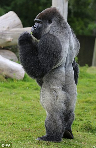 据英国《每日邮报》8月14日报道,家住在英国肯特郡林姆尼港野生动物园的大猩猩安巴姆今年已满24周岁,体重220公斤,但却能“人模人样”的直立行走,并且非常享受这个过程。2011年,安巴姆直立行走的照片上传到互联网上后,已经有数百万人点击观看。(网页截图)