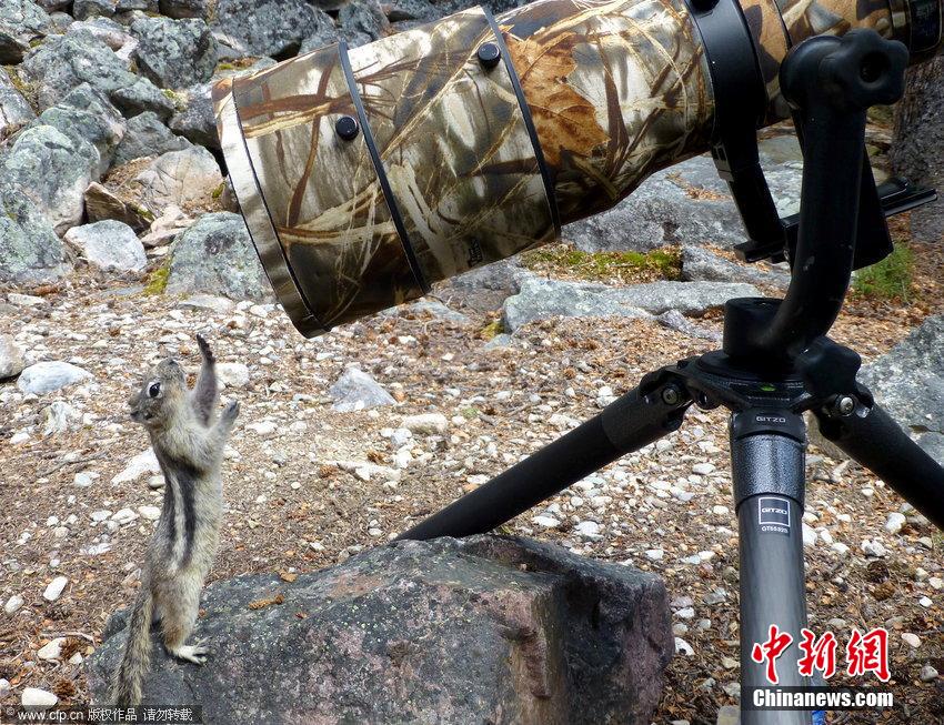 2014年8月16日消息(具体拍摄时间不详), Andy Skinner 和 Sarah Skinner夫妇是两位野生动物业余摄影师,他们一次外出拍照碰到一只饥饿的小松鼠,这只小松鼠镜头感十足,在镜头前不停摆动,甚至挥手,让人惊奇不已。图片来源:CFP视觉中国