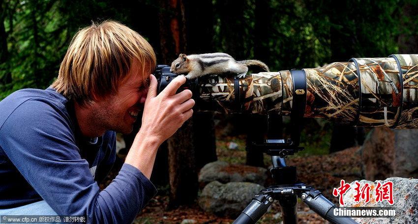 2014年8月16日消息(具体拍摄时间不详), Andy Skinner 和 Sarah Skinner夫妇是两位野生动物业余摄影师,他们一次外出拍照碰到一只饥饿的小松鼠,这只小松鼠镜头感十足,在镜头前不停摆动,甚至挥手,让人惊奇不已。图片来源:CFP视觉中国