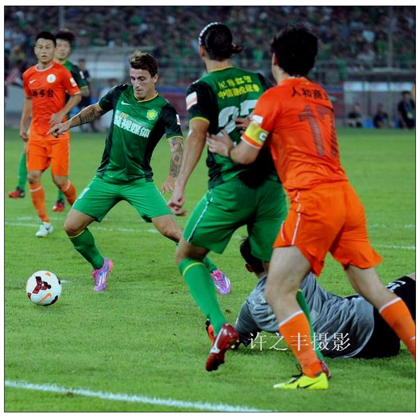 贵州人和出场名单: 12-张烈;23-陈昌源、4-萨利、17-孙继海、31-饶伟辉;11-尤里、8-李春郁、7-马辛斯基(45’,10-米西莫维奇)、21-于海、3-张成林;24-汉克(73’, 陈子介)。 许之丰摄影2014年8月18日记录于北京