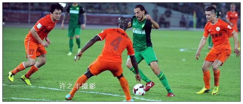 贵州人和出场名单: 12-张烈;23-陈昌源、4-萨利、17-孙继海、31-饶伟辉;11-尤里、8-李春郁、7-马辛斯基(45’,10-米西莫维奇)、21-于海、3-张成林;24-汉克(73’, 陈子介)。 许之丰摄影2014年8月18日记录于北京