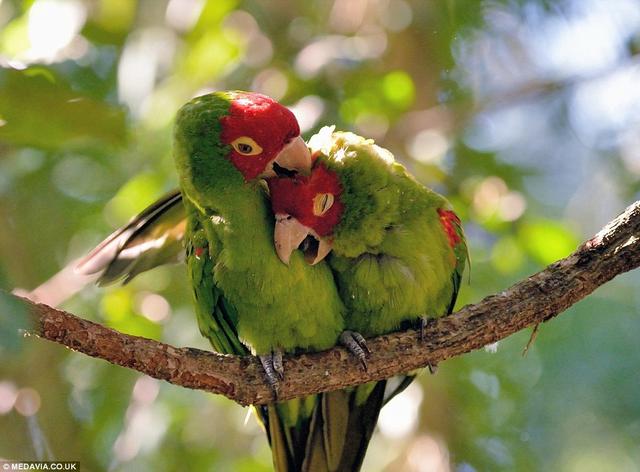 这对情侣鹦鹉被拍到站在枝头,互相偎依,身体紧紧地靠在一起,动作亲密不已。其中一只鹦鹉紧闭双眼,“一脸幸福”地把头埋在另一只鹦鹉身上,另一只鹦鹉则“深情地”注视着伴侣。两只鹦鹉羽毛颜色鲜艳,它们偎依在一起时而耳鬓厮磨,时而情话绵绵,整幅画面很有美感。