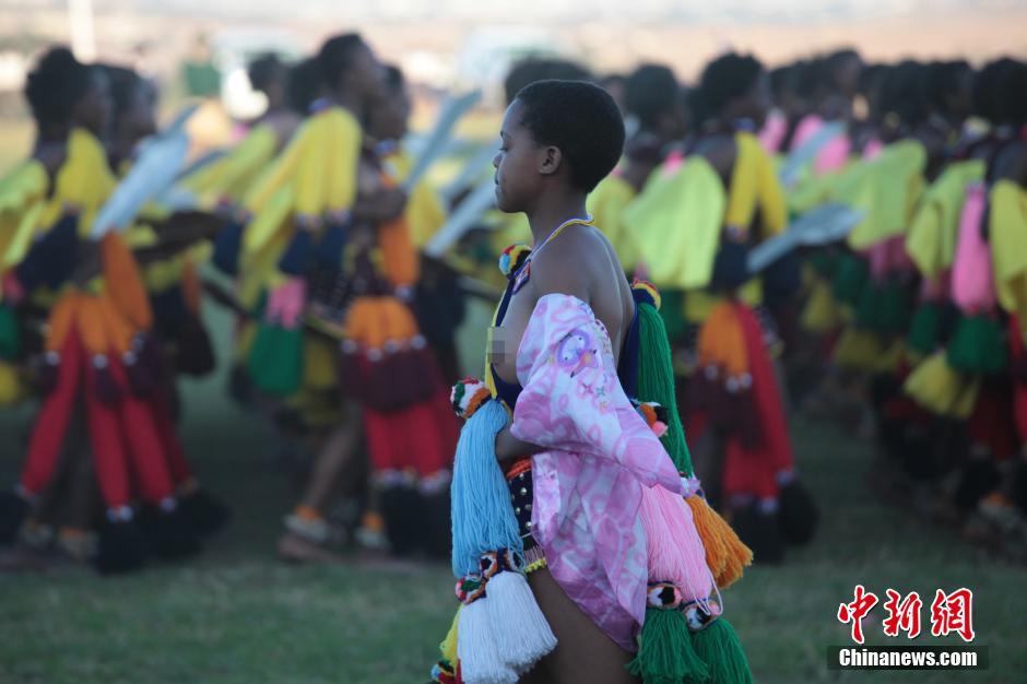 2014年8月27日至9月2日,南部非洲国家斯威士兰举行一年一度的“芦苇节”选秀女活动。近10万名未婚处女手持芦苇,袒胸露乳,伴随着音乐翩翩起舞,接受国王姆斯瓦蒂三世的遴选。一旦被国王选中,这些少女将获得数十头牛的厚重聘礼,并有望改变自己家族的命运。目前,姆斯瓦蒂三世已经纳有14位妃子。张楷 摄