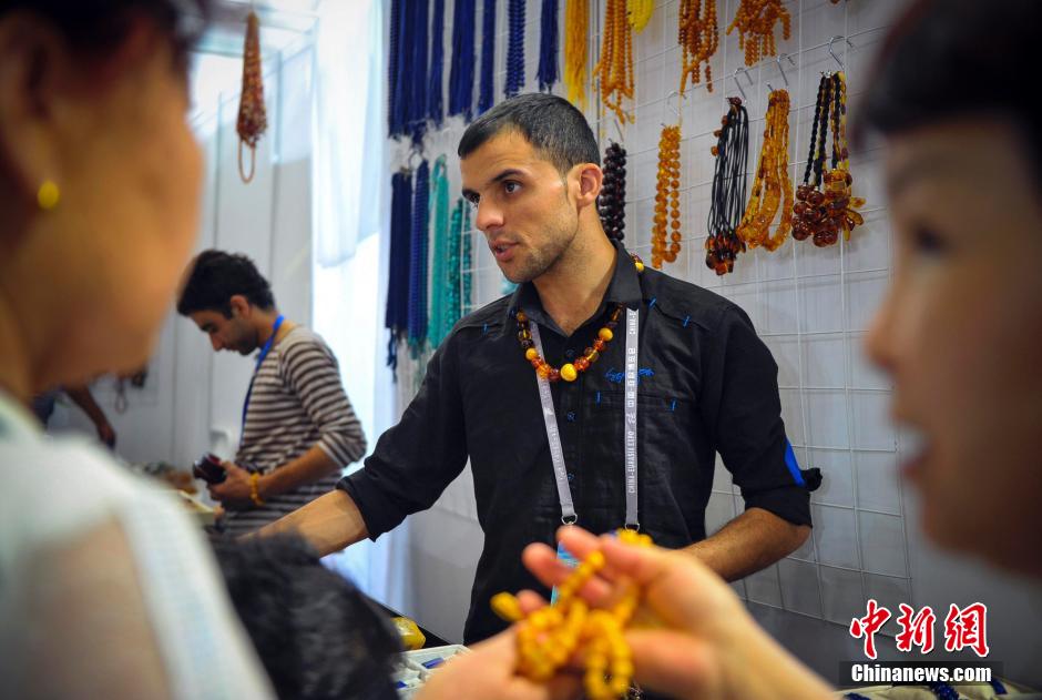 9月2日,第四届中国—亚欧博览会在乌鲁木齐的新疆国际博览中心如火如荼的进行中,阿富汗伊斯兰共和国展位,一位帅哥向与会者推销宝石。中新社发 刘新 摄