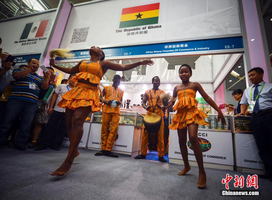 9月2日,第四届中国—亚欧博览会在乌鲁木齐的新疆国际博览中心如火如荼的进行中,加纳共和国展位前,几名舞者正在跳当地的民族舞蹈“热烈欢迎舞”,舞者随着鼓点的节奏甩动头部、屈伸腰部,粗犷的舞姿吸引众多围观者。中新社发 刘新 摄