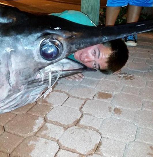 综合凤凰资讯据美国CNN新闻报道,近日美国一名17岁少年亚当-萨塔尔(Adam Sattar)在佛罗里达海岸捕到一条重达314公斤的剑鱼。图为萨塔尔兴奋地与他的猎物合影留念。