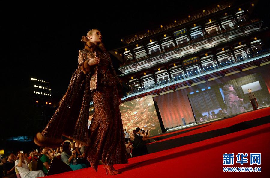 9月4日晚,一场顶级意大利品牌时装秀在西安大唐芙蓉园紫云楼南广场上演,来自国内外的众多模特身着时尚服装进行演绎,给古城观众带来一场视觉盛宴。新华社记者 刘潇摄