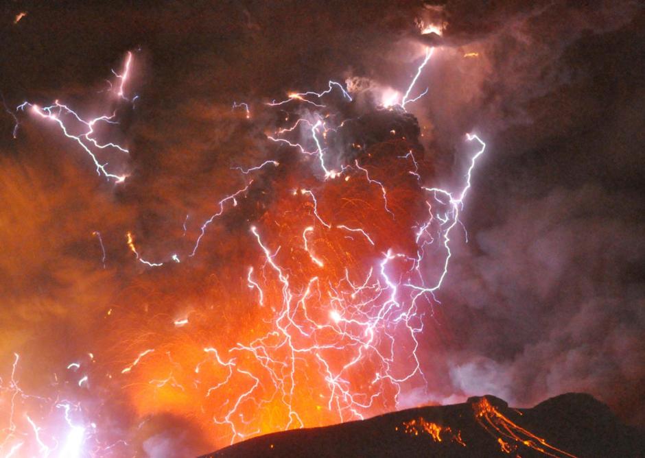 《雅虎新闻》2014年9月5日刊发一组闪电划过天空瞬间震撼照片。图为日本新闻社2011年1月28日拍摄并发行,宫崎县和鹿儿岛县之间,雾岛山的许多正在喷发中的火山口被闪电击中。来源:国际在线