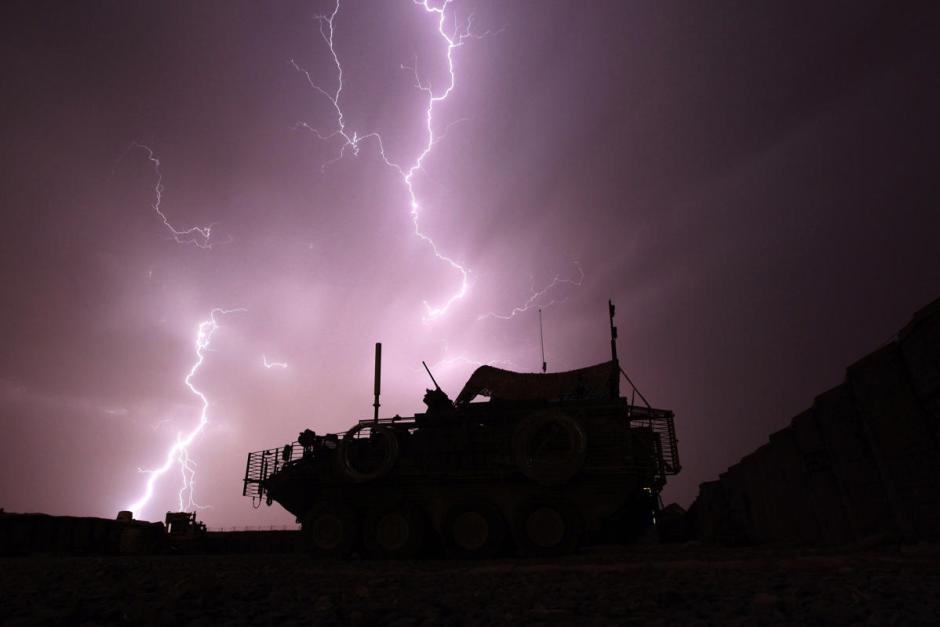 《雅虎新闻》2014年9月5日刊发一组闪电划过天空瞬间震撼照片。图为2010年4月19日,坎大哈省Maiwand区,部队在暴风雨中前进,闪电打在一辆步兵营的装甲车前方。来源:国际在线