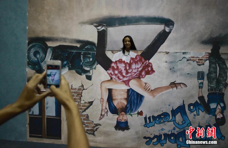 9月5日,一名游客在5D错觉道具前拍照。近日,天津市首届5D艺术展在青少年活动中心启幕,50余幅5D作品让市民及游客在亦真亦幻的空间里感受艺术魅力。据悉,5D艺术利用视觉差别和光学折射原理,在一个平面内可使人们直接感受到立体的互动艺术场景。艺术家们运用错视技法,再加上声光电等科技元素,给人们带来亲历其境的梦幻感觉和强烈神奇的视觉冲击。中新社发 佟郁 摄