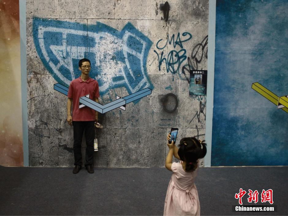 9月5日,游客体验5D错觉道具。近日,天津市首届5D艺术展在青少年活动中心启幕,50余幅5D作品让市民及游客在亦真亦幻的空间里感受艺术魅力。据悉,5D艺术利用视觉差别和光学折射原理,在一个平面内可使人们直接感受到立体的互动艺术场景。艺术家们运用错视技法,再加上声光电等科技元素,给人们带来亲历其境的梦幻感觉和强烈神奇的视觉冲击。中新社发 佟郁 摄