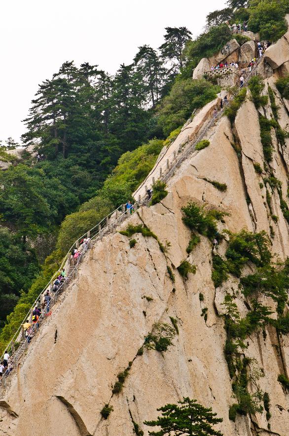 在这座著名的道教名山上,有一条嵌进山壁的长阶梯,或许是因为大家在这条崎岖阶梯上已经头晕目眩、惊险万分,已无暇分心去数到底有多少级阶梯,目前为止还没有准确的阶梯级数。阶梯有3块木板宽的栈道只有一条铁链扶手,是世上最惊险恐怖的阶梯栈道。待登上黄山峰顶,就能坐在偏僻的茶楼里观赏黄山胜景,可谓人间天堂。