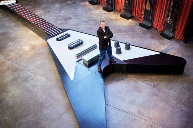 最大的吉他:这款吉他是1967年款Gibson Flying V体积的12倍,高达13.29米,宽5.01米,重达907公斤。美国得克萨斯州的学生花费1975美元(约合人民币12110元)制作吉他的木质主体,并使用航空用钢丝绳制作琴弦。