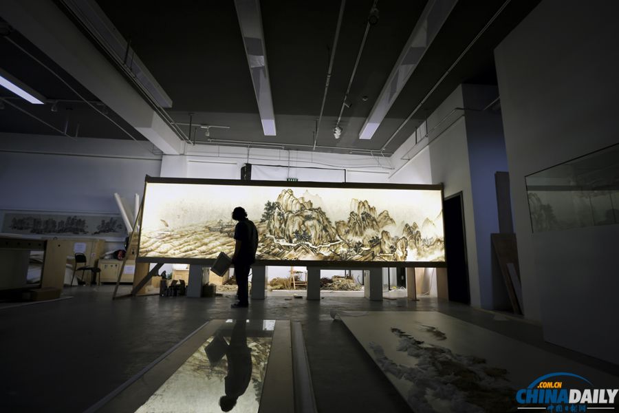 徐冰在工作室创作大型装置作品《江山万里图》。(记者 姜东 摄)
