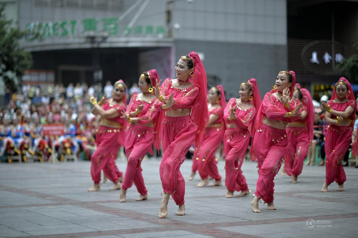 詹家溪街道舞蹈队的大妈们赤脚、露肚脐跳起了舞蹈《宝莱坞》。