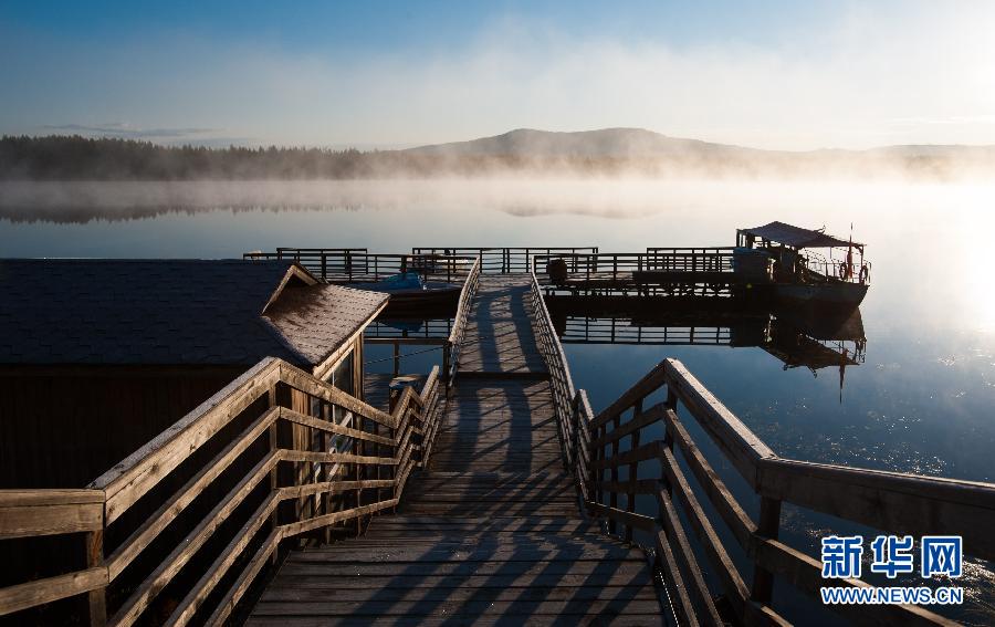 这是清晨时分的阿尔山杜鹃湖风光(9月18日摄)。杜鹃湖位于内蒙古阿尔山国家森林公园内,因春季湖畔开满杜鹃花而得名。杜鹃湖呈月牙形,是火山喷发形成的堰塞湖。 新华社记者 李任滋 摄