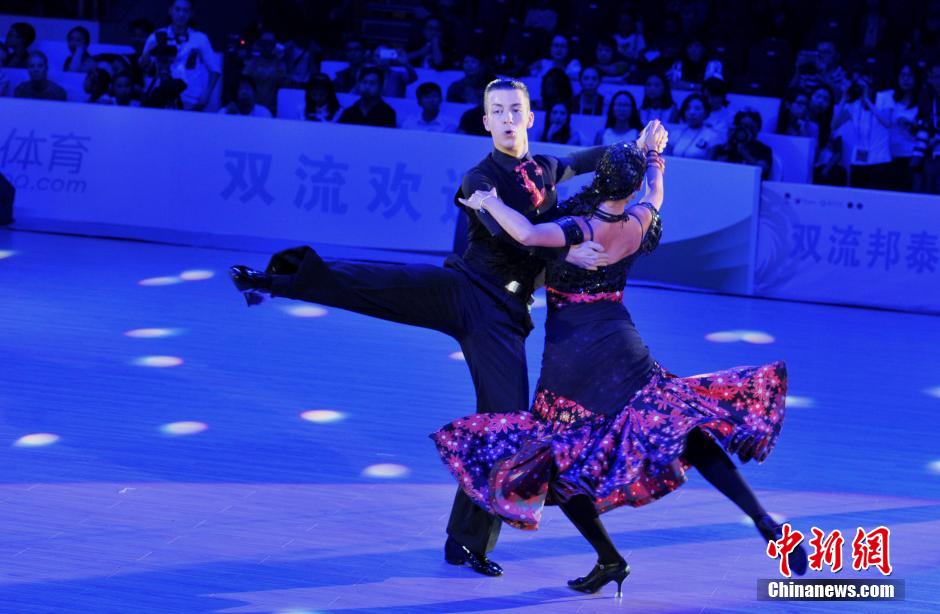9月20日晚,参赛选手正在比赛,优美的舞姿给观众带来一场视觉盛宴。当日,2014年WDSF世界体育舞蹈大赛在成都拉开战幕,来自德国、意大利、俄罗斯等28个国家和地区的舞林高手和1000余名国内选手在两天时间里为成都观众献上一场舞蹈盛宴。据悉,世界体育舞蹈大赛的前身为世界体育舞蹈节,在成都已连续举办了五年。中新社发 刘忠俊 摄