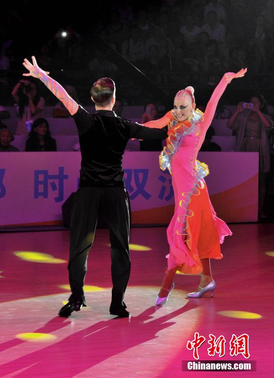 9月20日晚,参赛选手正在比赛,优美的舞姿给观众带来一场视觉盛宴。当日,2014年WDSF世界体育舞蹈大赛在成都拉开战幕,来自德国、意大利、俄罗斯等28个国家和地区的舞林高手和1000余名国内选手在两天时间里为成都观众献上一场舞蹈盛宴。据悉,世界体育舞蹈大赛的前身为世界体育舞蹈节,在成都已连续举办了五年。中新社发 刘忠俊 摄