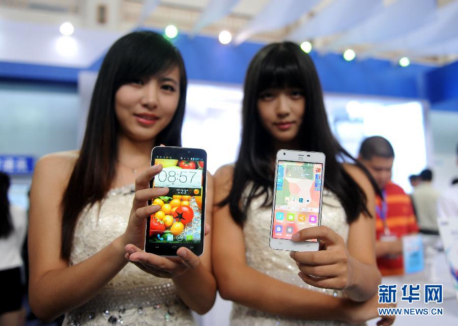 9月28日,模特在展览会现场展示新款手机。当日,2014中国(沈阳)国际手机博览会暨移动互联网产业博览会在沈阳工业展览馆开幕。本届博览会以“智能终端、移动互联、畅想未来”为主题,围绕移动互联网创新应用与生活应用,展示了智能生活、移动健康、移动娱乐、智慧城市等内容。新华社发(姜冰 摄)