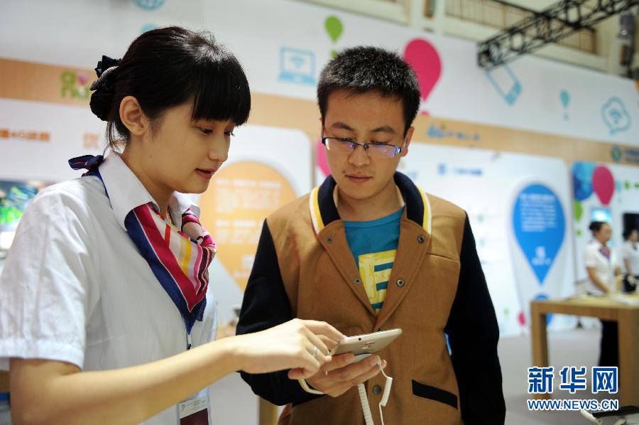 9月28日,参展商家工作人员在手机博览会上向消费者介绍参展手机。当日,2014中国(沈阳)国际手机博览会暨移动互联网产业博览会在沈阳工业展览馆开幕。本届博览会以“智能终端、移动互联、畅想未来”为主题,围绕移动互联网创新应用与生活应用,展示了智能生活、移动健康、移动娱乐、智慧城市等内容。新华社发(姜冰 摄)