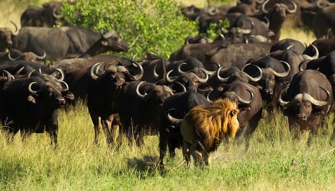 人民网10月8日讯 一头南非克鲁格国家公园的雄狮最近尝到了“寡不敌众”的苦果。这头老年雄狮此前被另外四头年轻的雄狮赶出狮群并在争斗过程中受伤。当这头落单的雄狮在草原游荡时碰到了一大群野水牛,后者因为嗅到狮子的气味而冲过来。
