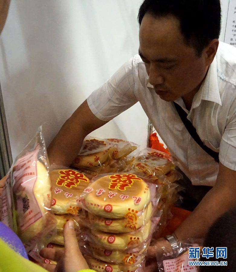 10月12日,山东乳山大喜饼项目传承人于彬在非遗博览会上销售大喜饼。第三届中国非物质文化遗产博览会10日至13日在山东济南举行。博览会吸引近700个非遗项目参展,全面展示我国非遗保护传承和振兴发展的成果。新华社记者 冯杰摄