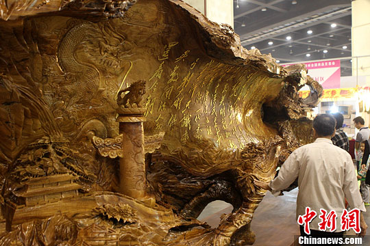 10月11日,第二十届郑州全国商品交易会上,一件8米长、2米余高的香樟木雕鎏金《沁园春·雪》吸引了不少消费者驻足观看。中新社发 王中举 摄
