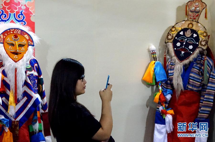 10月12日,一位观众在第三届中国非物质文化遗产博览会上拍摄西藏民族服饰。新华社记者冯杰摄