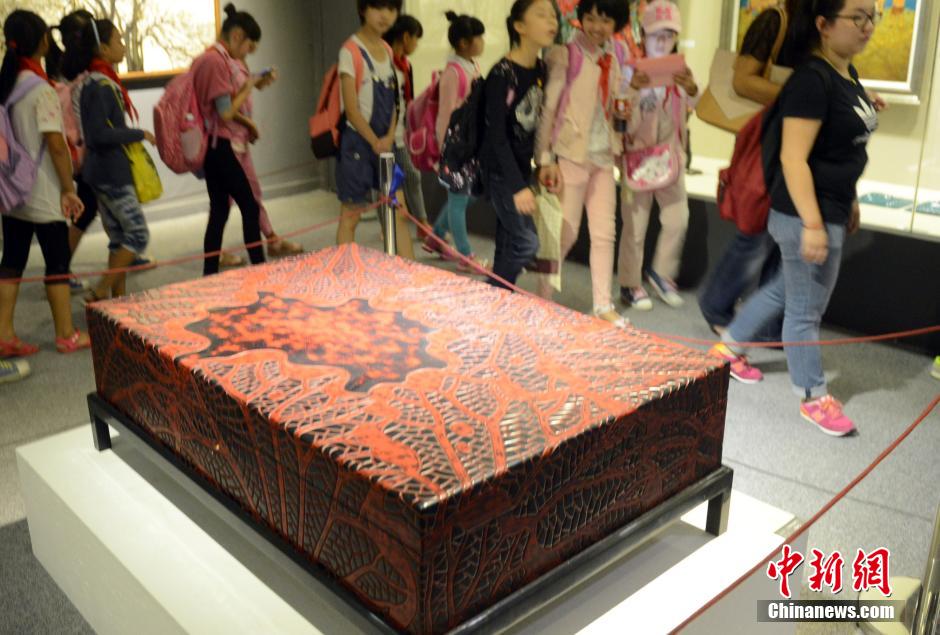 10月14日,正在福建省博物院举办的大漆艺术——2014海峡漆艺术大展上共有来自大陆和台湾的500多件漆艺作品参展。本次大展以大漆艺术作为主题,旨在传递及弘扬大漆艺术所具有的静观内省、溫柔孰厚的东方文化气质,吸引众多观众观展。 刘可耕 摄