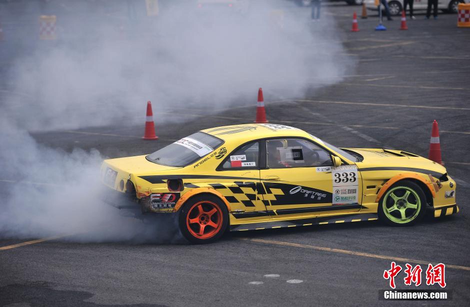 10月14日,重庆参赛选手正在练习飘移车技。2014中国汽车飘移锦标赛重庆站新闻发布会在体育局召开。据介绍,赛事将于11月13日至11月15日在重庆市奥林匹克运动中心举行,近20支来自各地车队共50名车手参赛,将上演“速度与激情”的表演。中新社发 陈超 摄