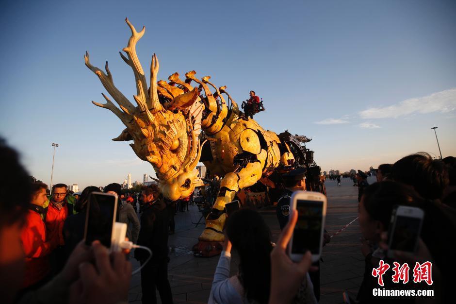 10月15日,法国机械“龙马”在北京鸟巢外试运行,吸引众多市民观看。据悉,中法建交50周年纪念项目—法国机械“龙马”巡游表演将于10月17日至19日在奥林匹克中心区举行。中新社发 杜洋 摄