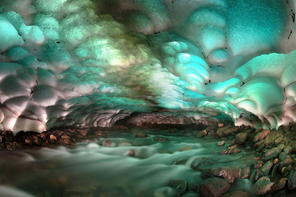 2014年10月17日报道(具体拍摄时间不详),洞顶闪耀着绚丽的海绿色,光看照片的话,很容易以为这是用珍贵绿宝石做成的洞穴,但事实上,这只是一个普通的冰洞,绚烂的颜色只是太阳反射的效果。