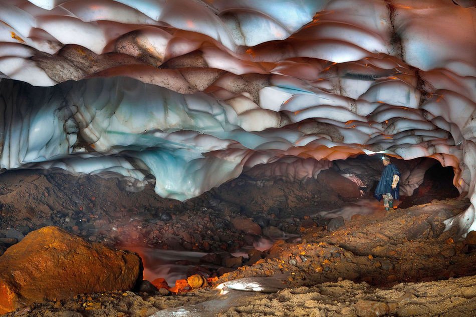 2014年10月17日报道(具体拍摄时间不详),洞顶闪耀着绚丽的海绿色,光看照片的话,很容易以为这是用珍贵绿宝石做成的洞穴,但事实上,这只是一个普通的冰洞,绚烂的颜色只是太阳反射的效果。