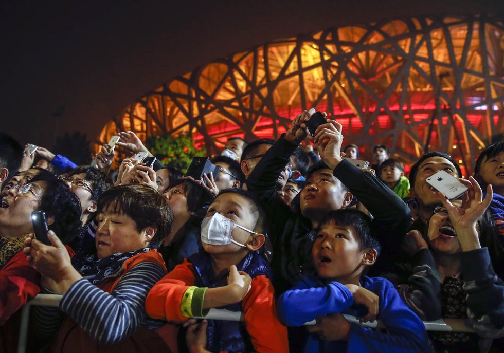 10月19日,北京国家体育场外广场,法国“龙马”巡游举行了闭幕演出,图为观众集中注意力观看。