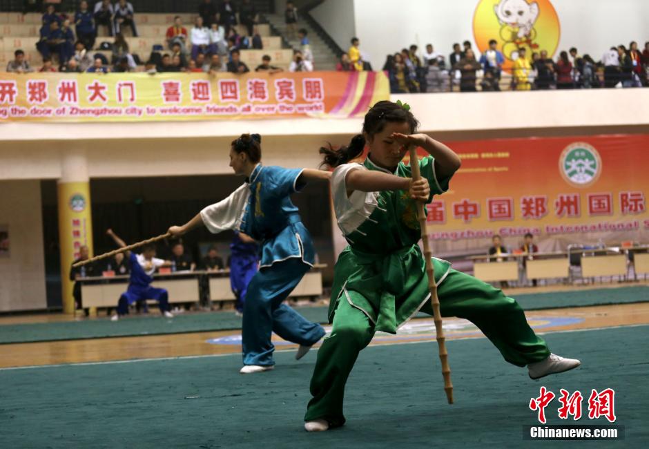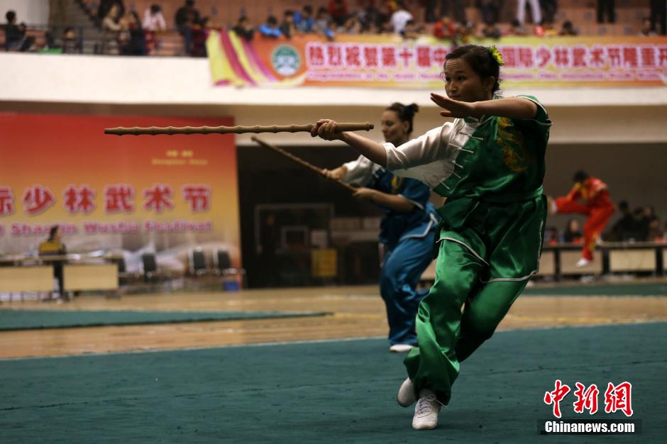 10月21日晚,来自吉尔吉斯共和国的参赛选手在进行国际女子C组虎尾鞭比赛。当日,一种古老罕见的武当内家秘传套路虎尾鞭亮相第十届中国郑州国际少林武术节武术比赛现场,虎尾鞭又名武当松溪短棍,其动作古朴无华,粗旷洒脱,一招一势极重攻防。它融刀之迅猛、棍之活便、剑之轻灵为一体,具有以静制动、后发先至的显著特点。虎尾鞭结构短小精练,其动作势势相承、环环相扣、长短相依、首尾呼应,演练起来凌厉迅猛、呼呼生风,如秋风扫叶,气势磅礴而飘洒。 杨正华 摄