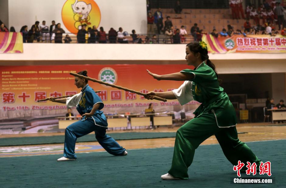10月21日晚,来自吉尔吉斯共和国的参赛选手在进行国际女子C组虎尾鞭比赛。当日,一种古老罕见的武当内家秘传套路虎尾鞭亮相第十届中国郑州国际少林武术节武术比赛现场,虎尾鞭又名武当松溪短棍,其动作古朴无华,粗旷洒脱,一招一势极重攻防。它融刀之迅猛、棍之活便、剑之轻灵为一体,具有以静制动、后发先至的显著特点。虎尾鞭结构短小精练,其动作势势相承、环环相扣、长短相依、首尾呼应,演练起来凌厉迅猛、呼呼生风,如秋风扫叶,气势磅礴而飘洒。 杨正华 摄