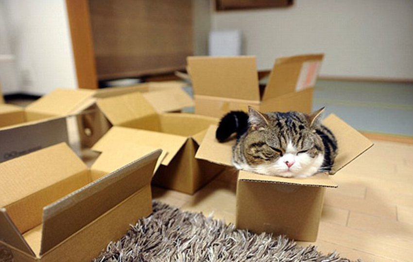 猫咪睡在在刚拆开的箱子里,这里已成为它的领地。(网页截图)