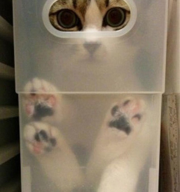 这只猫咪躲在了塑料储藏罐中,看上去好像在试镜《星球大战》。(网页截图)