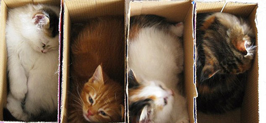 主人为他四只躲在箱子中的猫咪照了个集体照。(网页截图)