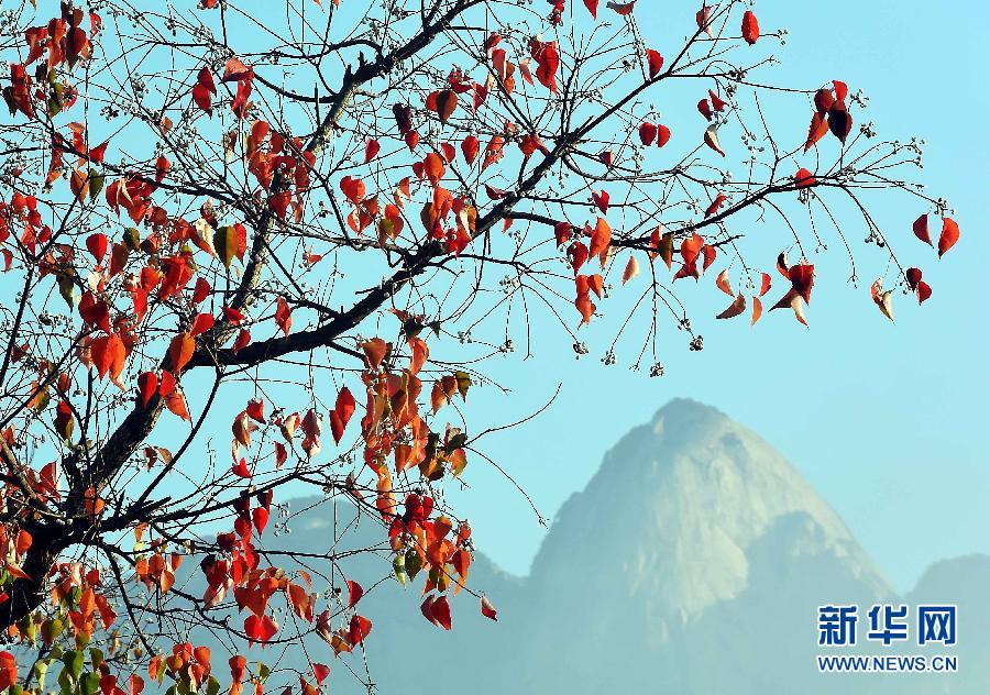 霜染的红叶与远处的山峰相互衬映(10月22日摄)。近日,位于湖北省罗田县的大别山国家森林公园秋色渐浓,山水间云雾缭绕,田园处层林尽染,景致秀美迷人,犹如“世外桃源”。 新华社记者 王颂摄