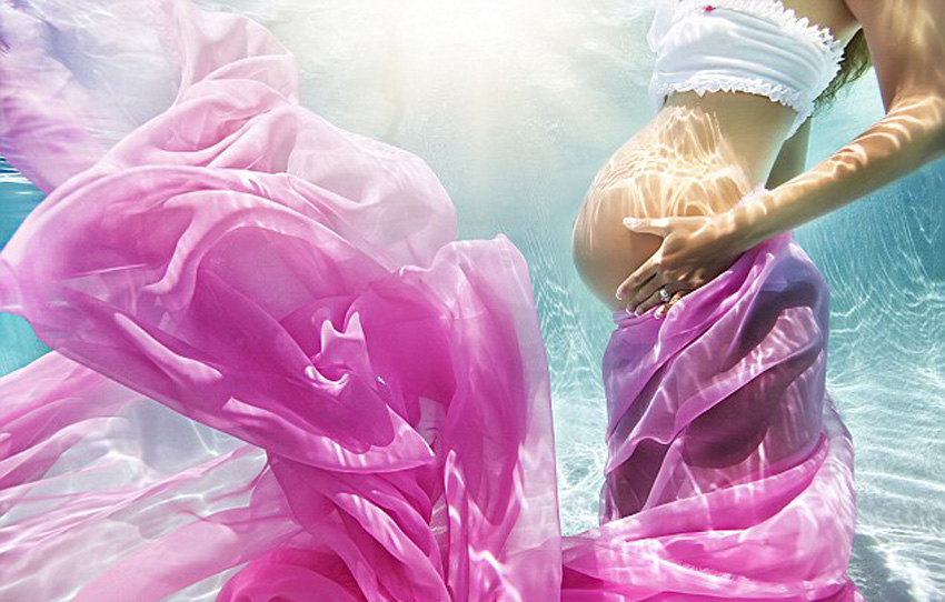 照片中孕妇身着薄纱礼服,在光影的映射下美丽动人。(网页截图)