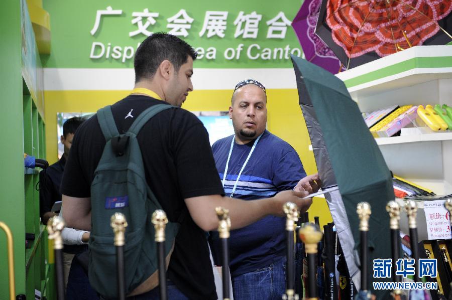 10月23日,几名采购商在广交会二期上采购雨伞等日用品。当日,第116届中国进出口商品交易会第二期在广州开幕,本期展览为期5天,主要参展商品为日用消费品、礼品、家居装饰品等。 新华社记者梁旭 摄