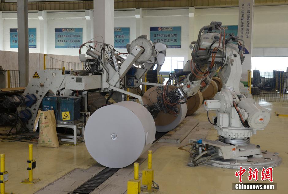 图为10月24日拍摄的华泰集团年产70万吨高级铜版纸捆包车间,工人正在操作叉车搬运铜版纸。 中新社发 侯宇 摄