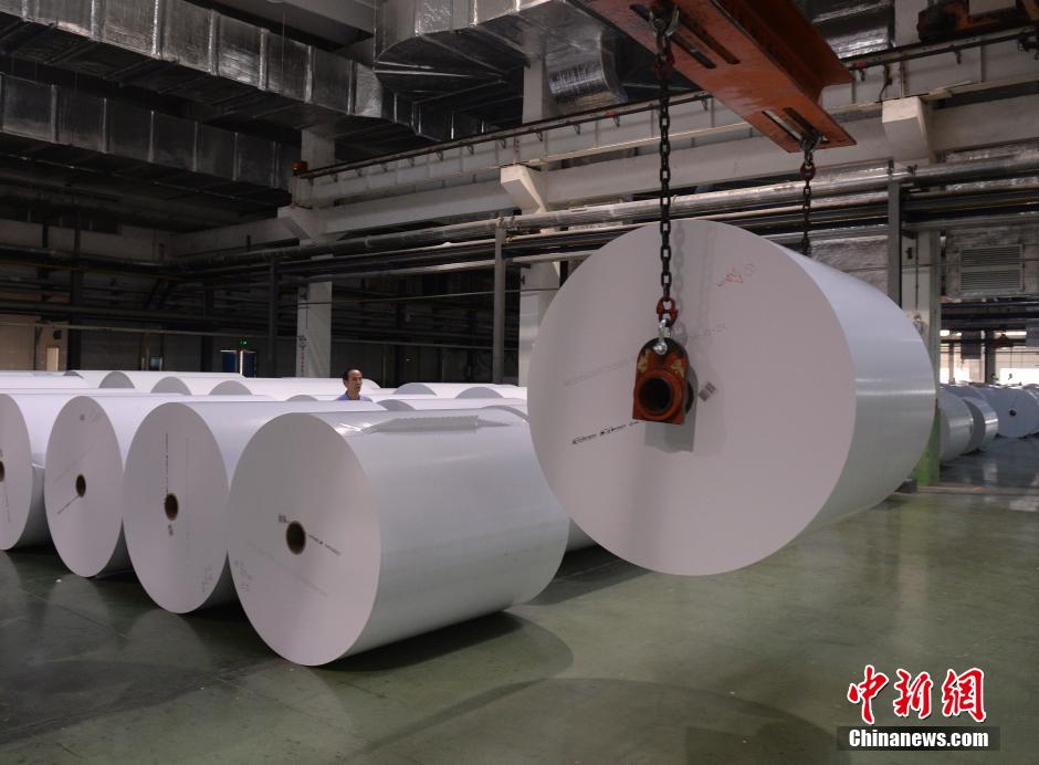 图为10月24日拍摄的华泰集团年产70万吨高级铜版纸捆包车间,工人正在操作吊车搬运铜版纸。 中新社发 侯宇 摄