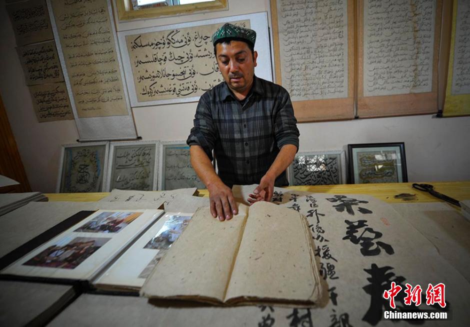 10月下旬,新疆和田地区墨玉县普恰克其乡布达村,45岁的吐尔逊巴克正在自家作坊中带着徒弟们制作古老的桑皮纸,吐尔逊巴克已是家族第十代桑皮纸制作传人。桑皮纸是以桑树皮为原料制成的一种纸,它是西域最古老的纸张之一,因为诞生于汉代,又被称为汉皮纸。传统的桑皮纸制作过程包括削桑树皮、浸泡、锅煮、捶捣、发酵、过滤、入模、晾晒、粗磨等九道工序,全部由手工完成,费力辛苦。桑皮纸最大的特点是柔嫩、防虫、拉力强、不退色、吸水力强、不会被虫蚀,并且可以存放很长时间。在清朝和民国时期被广泛用于和田地方政府的典籍书册、纸币发行、学校课本、学生用纸、药材包装等,到20世纪40年代、50年代时,和田的公文、契约和包装等还在使用桑皮纸。图为,吐尔逊巴克向记者展示家中传下来的“老纸”。 刘新 摄