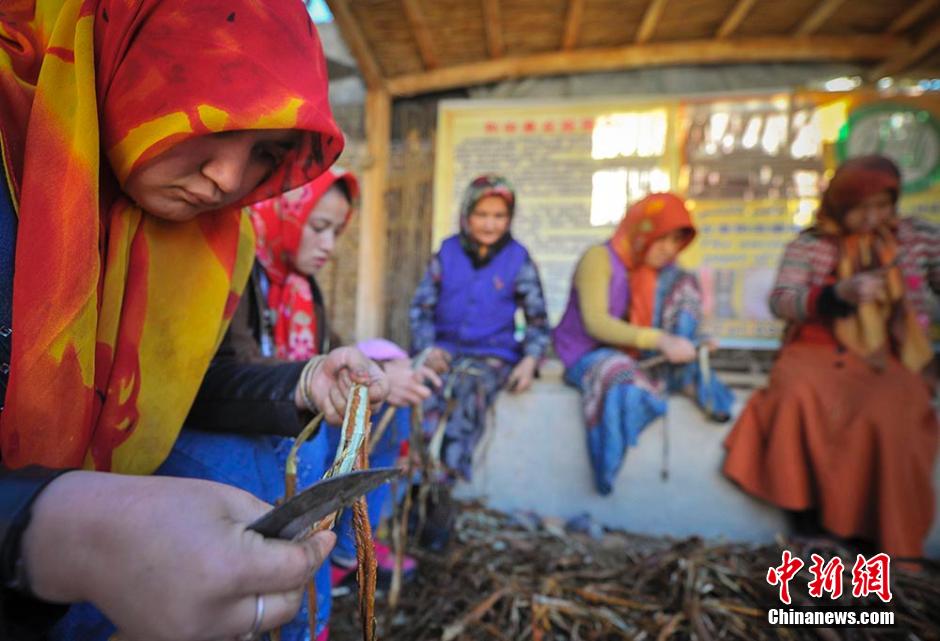 图为,家庭作坊里,妇女们正围坐在一起剥桑树皮。 刘新 摄